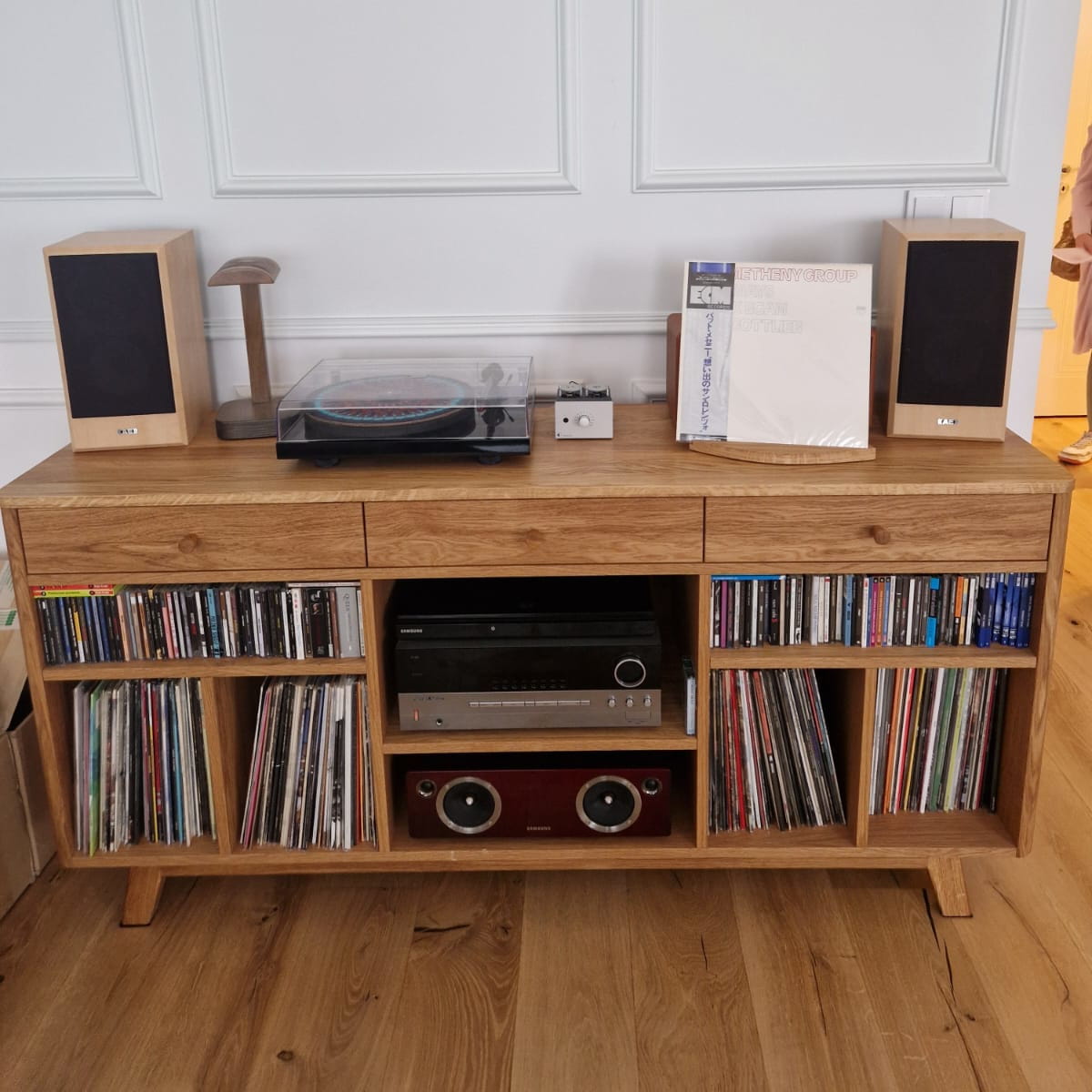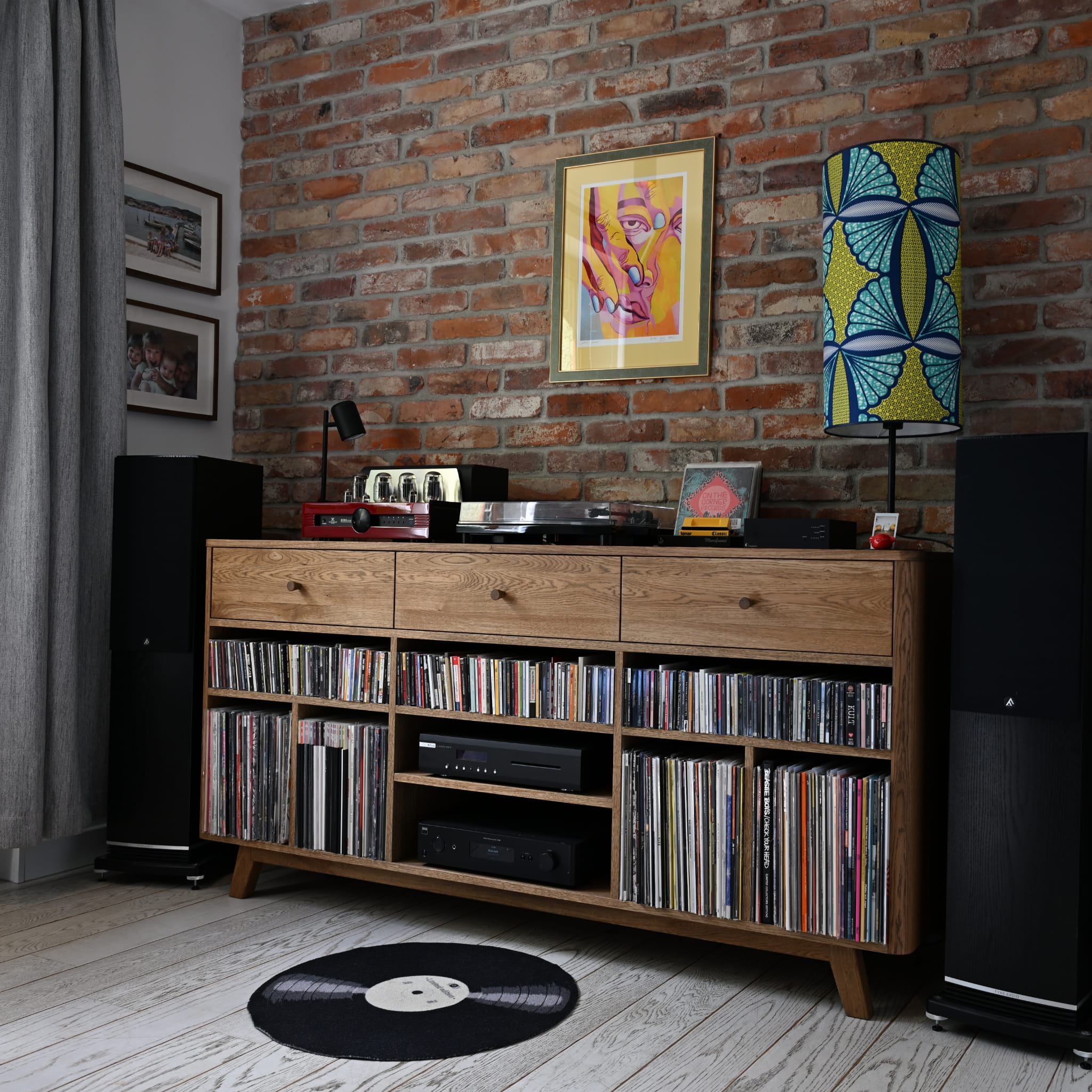Ręcznie wykonana z litego drewna dębowego komoda to propozycja dla tych, którzy szukają praktycznego, a zarazem estetycznego sposobu na uporządkowanie swojej muzycznej kolekcji. Wyższy model został zaprojektowany z myślą o przechowywaniu zarówno płyt winylowych, jak i CD, oferując jeszcze więcej miejsca i wygody.