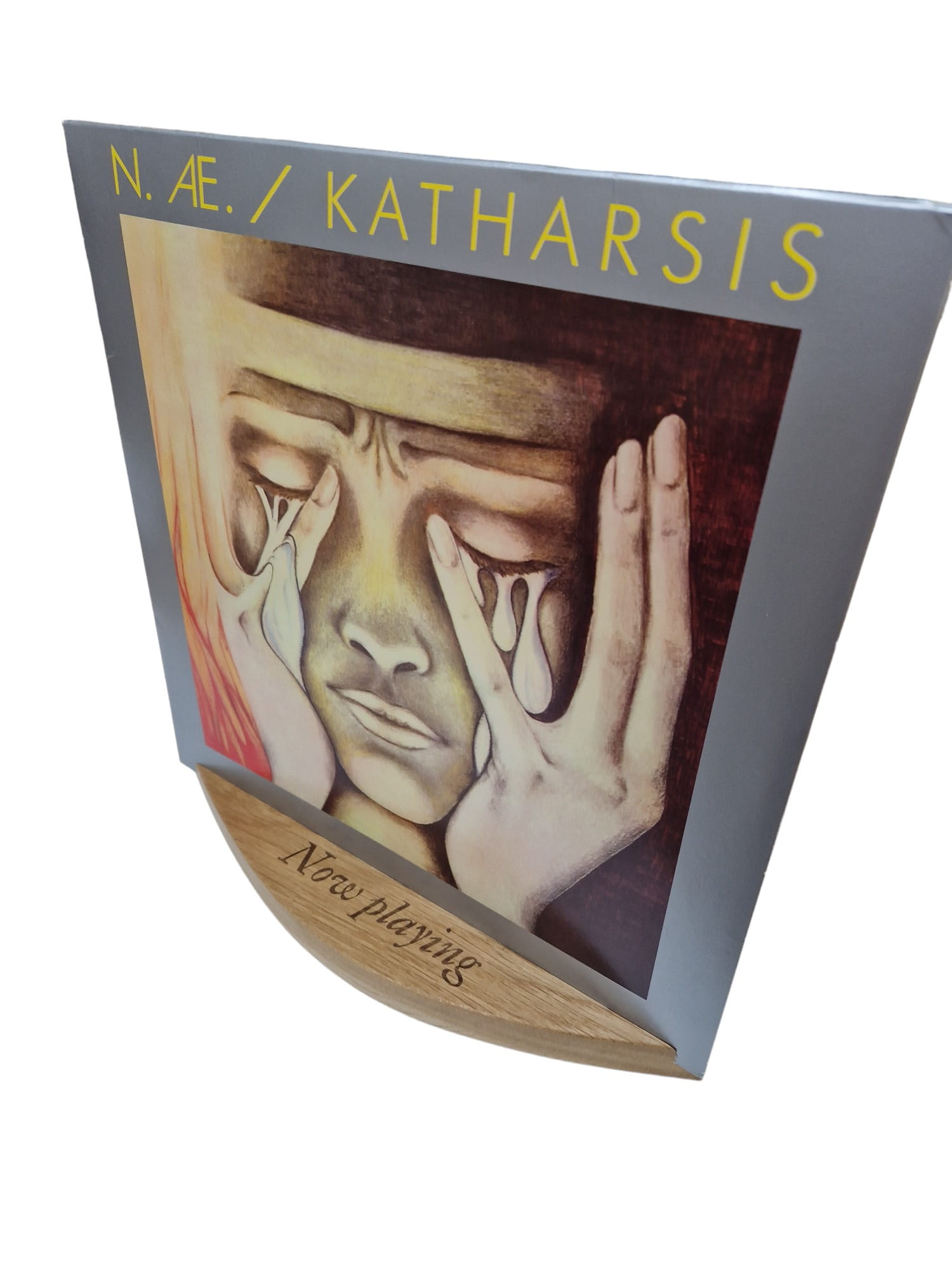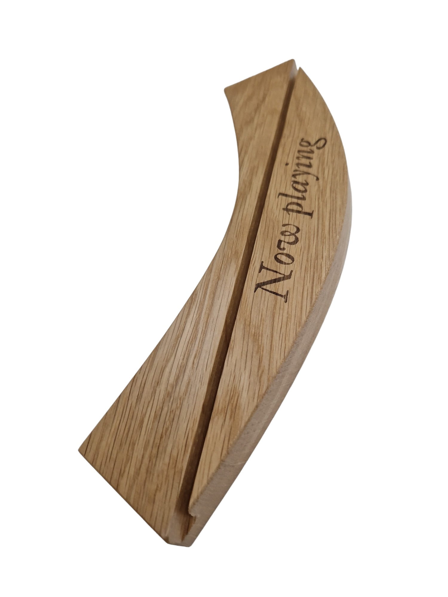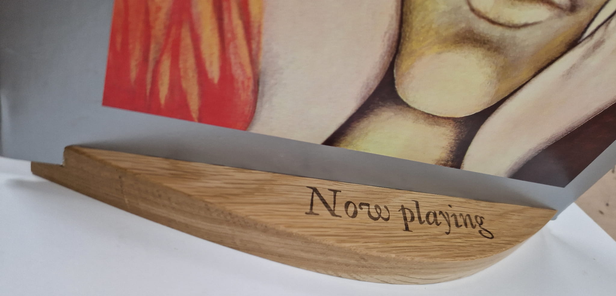 Stojak z wypalonym napisem "Now playing" idealnie nada się do prezentowania płyty którą aktualnie mamy w gramofonie.