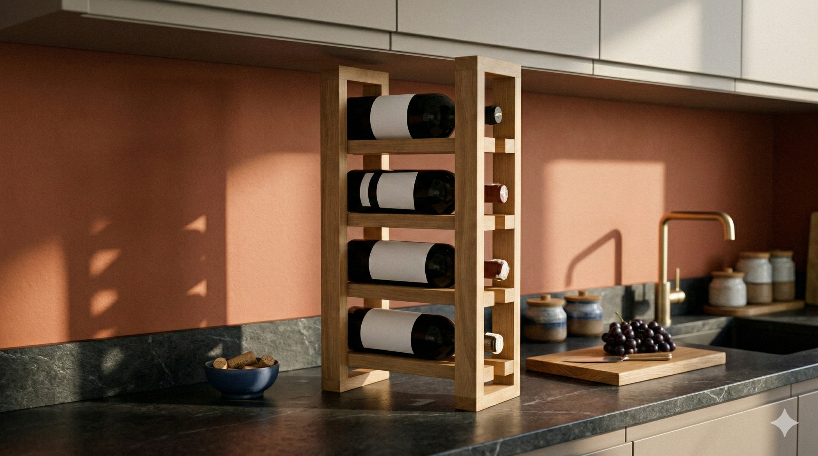 Dodaj swojej kuchni, jadalni lub salonowi nutę luksusu dzięki naszemu ręcznie wykonanemu stojakowi na wino z litego drewna dębowego. Ten kompaktowy stojak pomieści do 4 butelek wina, prezentując je w stylowy i uporządkowany sposób.